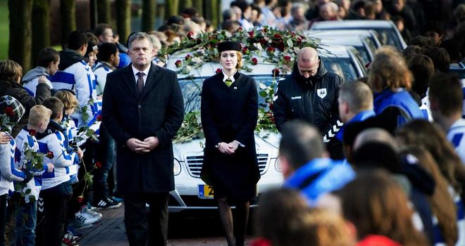 Members of SC Buitenboys lay roses on the hearse carrying Richard Nieuwenhuizen